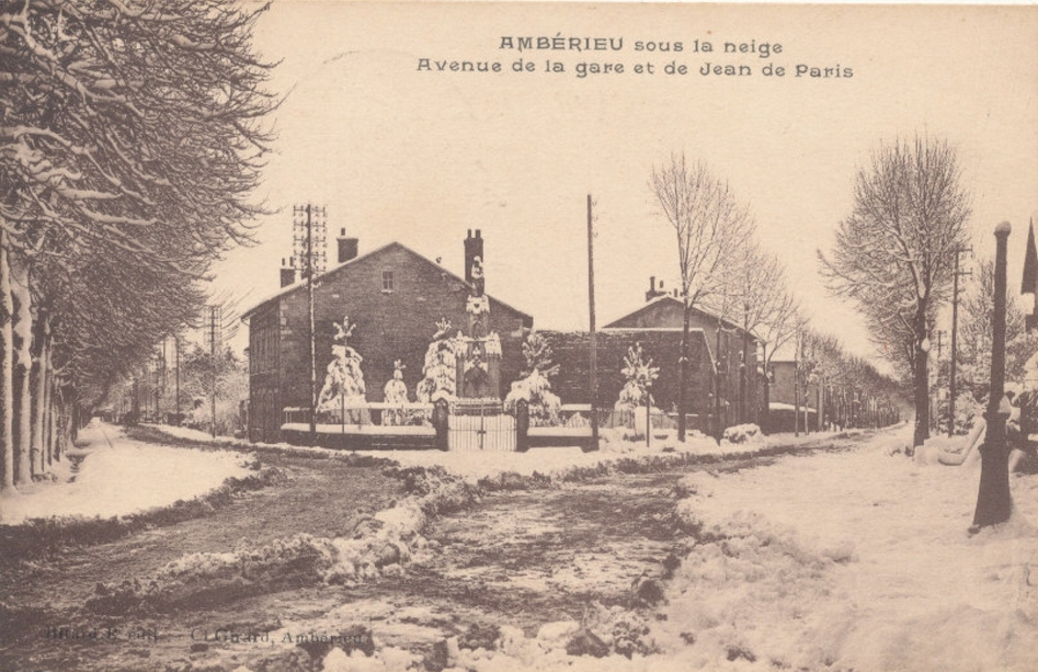 Cette photo nous rappelle que les hivers ont désormais bien changé. Il n’était pas rare en plaine comme sur Ambérieu que la neige s’invite de façon importante. Cette image nous renvoie probablement dans les années 1910-1920. Nous sommes dans le quartier proche de la gare où désormais la circulation est bien pus dense !. Nous sommes probablement au coin de l’angle entre l’avenue Paul Painlevé et à gauche l’avenue de la Libération, beaucoup moins arborée de nos jours. La dernière fois où Ambérieu a connu d’importants épisodes neigeux remontent déjà aux années 2009-2010.